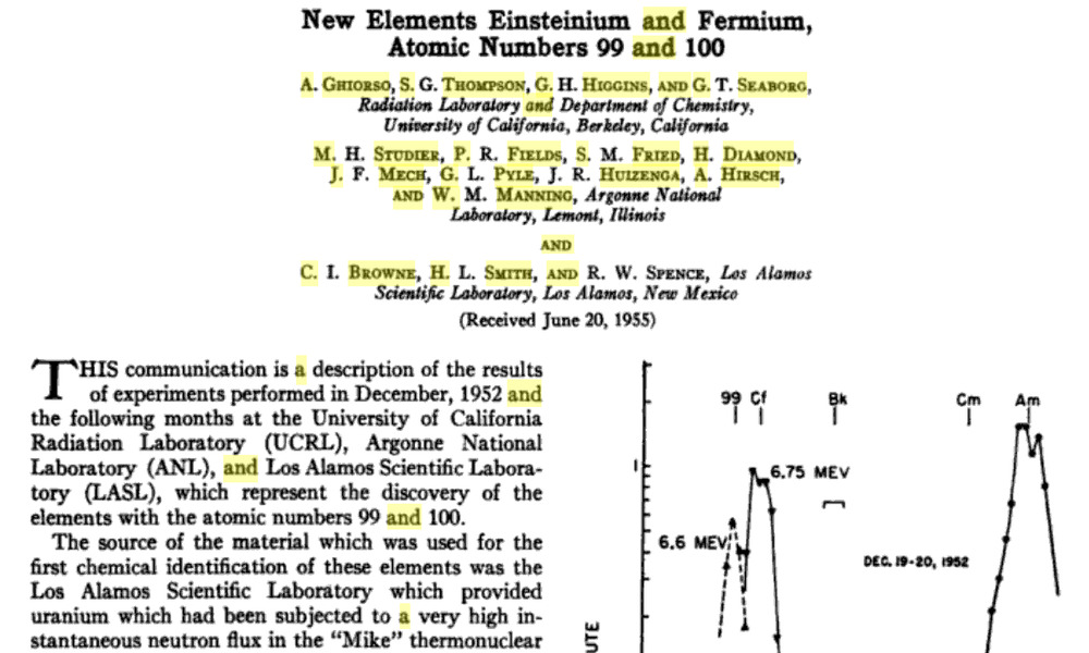 “Fuel tanks on the airplane’s wings had been modified to scoop up and filter passing debris. The filters from the surviving planes were sealed in lead and sent to Los Alamos, New Mexico for analysis. Radioactive and contaminated with calcium carbonate, the “Mike” samples were extremely difficult to handle. Scientists at Los Alamos found traces in them of isotopes plutonium-246 and plutonium-244. Ghiorso, Thompson and Seaborg obtained half a filter paper from the Ivy Mike test. They were able to detect the existence of the elements einsteinium and fermium, which had been produced by intensely concentrated neutron flux about the detonation site. The discovery was kept secret for several years, but the team was eventually given credit. In 1955 the two new elements 99 and 100 were named in honor of Albert Einstein and Enrico Fermi.”