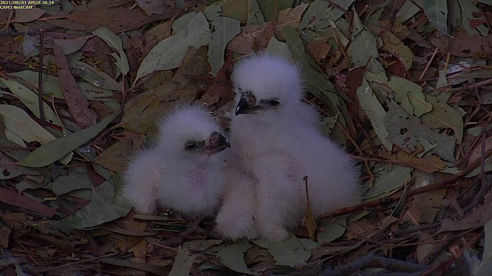 These eagles lay two eggs every year, often with unexpected results. On this nest, the first eggs hatched yesterday.