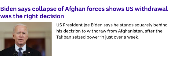A US intelligence assessment earlier in the week had said Kabul could be encircled in 30 days and could fall to the Taliban within 90 days, but the insurgents captured most of Afghanistan’s major cities in less than a week and entered the capital on Sunday.