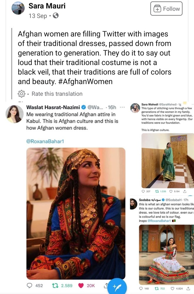 I saw a link which has since disappeared? It spoke of how the Afghans are attempting to show how colourful their clothes and lives were, before the Taliban made women wear black.