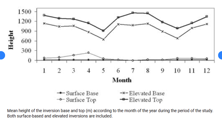 I’ll start by debunking “inversion layer”. This is a relatively rare phenomenon that forms on only some locations for some periods of time. It occurs when a layer of stable air sits over the top of some neutrally stable (slightly turbulent) air. Pollution rises much more rapidly through the turbulent air than through the stable air, which under rare conditions traps pollution at lower levels causing severe pollution problems for some cities. But it’s temporary, lasting two to three weeks at worst.