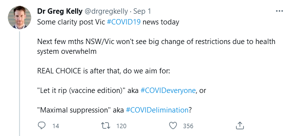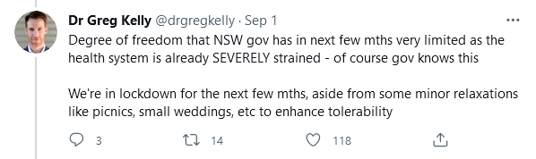 I wouldn’t go so far as to call it a nonsense. The issue with the Doherty report is that it’s being treated as a gospel and has become a political tool for politicians who wish to cherry-pick the parts they like and ignore the rest. The report models for a very specific set of circumstances: low caseloads with moderate-to-strong TTIQ, along with recommendations for masks, etc.. Neither of those things (caseloads; TTIQ) are as per the model at present (particularly in NSW; but even the caseload in VIC is too high for the model’s optimal success), and so the model at present isn’t applicable.