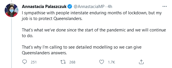 “We’re in this situation because the Prime Minister hasn’t got the vaccine rollout working and didn’t set up a fit for purpose quarantine system. Now that he’s back in Canberra I hope he’s spending time making sure Australians get vaccinated.