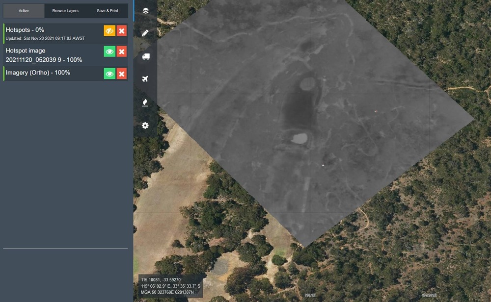 The plane did its passes at 2000 feet and found 4 definites, and 5 possibles. Upon locating them on the ground, none were larger than 1m, none were burning but 4 were smouldering, the smallest being 250mm across. Most of those were below tree canopy, so the sensitivity of the camera is excellent.