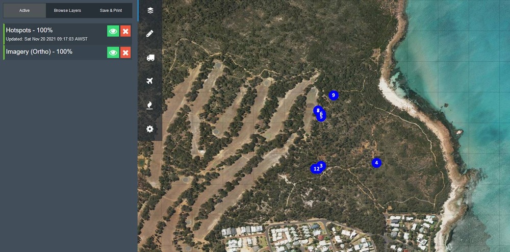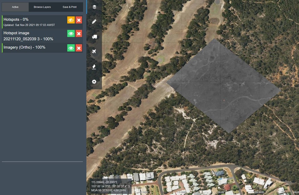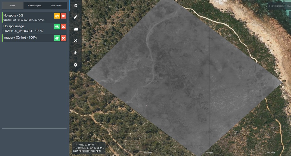 Yesterday my task as fire captain was to locate and verify multiple hotspots in the A class reserve next to town. We had conducted a cool burn through there 10 days ago, and the season is warming up and drying out so it was important to extinguish any remaining fire in an extreme fire risk area. We were able to get the new Linescanner plane to do a few passes with the high resolution infrared camera, and DFES wanted me to go find the hotspots, take pictures, describe the immediate area and finally to extinguish them.