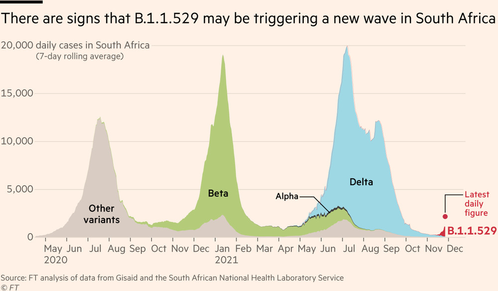 The chief executive of Moderna has predicted that existing vaccines will be much less effective at tackling Omicron than earlier strains of coronavirus and warned it would take months before pharmaceutical companies could manufacture new variant-specific jabs at scale. Stéphane Bancel said the high number of Omicron mutations on the spike protein, which the virus uses to infect human cells, and the rapid spread of the variant in South Africa suggested that the current crop of vaccines may need to be modified next year. A Stanford University study of a Delta outbreak at a California prison published last month found that Moderna’s jab was 56.6 per cent effective against infection — substantially lower than the level in studies conducted before the emergence of the variant, the researchers said.