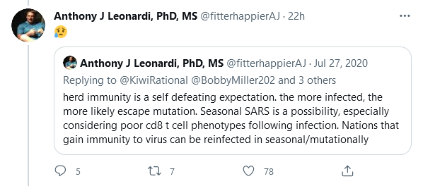 you can assume the more covid occupying the mass human petri dish that the possibility of covid evolving continues, that evolution of covid has been and likely will further be helped by greater numbers of infections