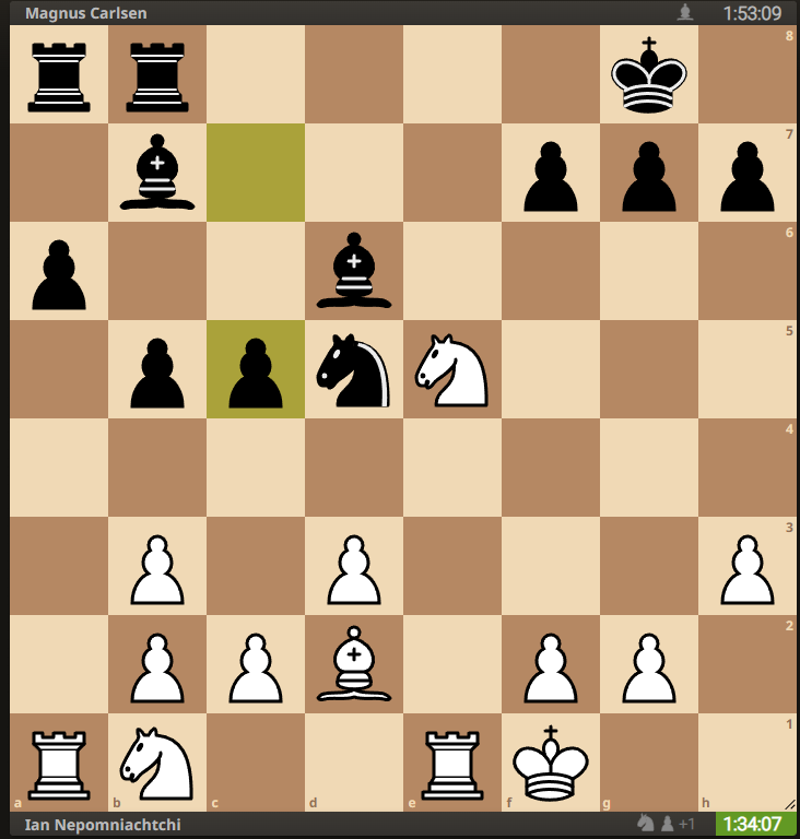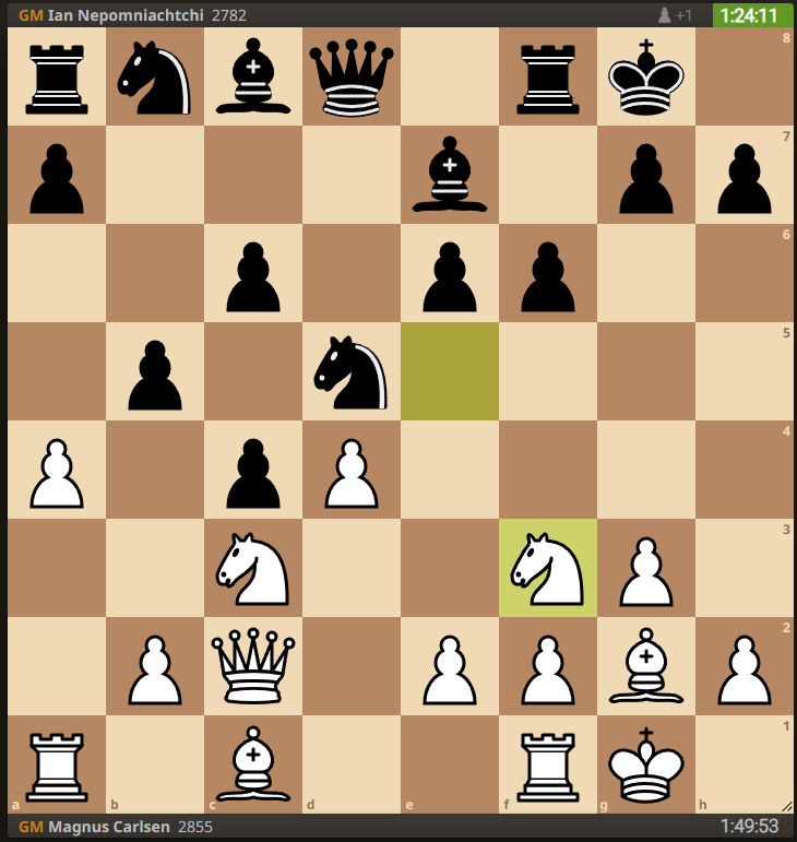 Game 10. Magnus has white and is up three games. Realistically it’s all over; there’s 5 games to go and Nepo would have to win 3 out of the 5, and not lose the other two, just to draw the series. Magnus hasn’t lost a classical time game in about a bazzillion years.