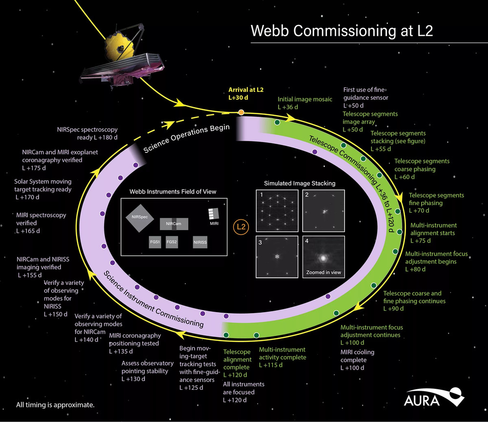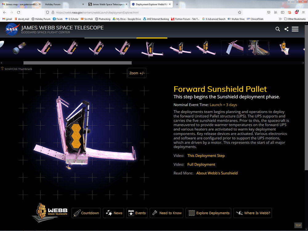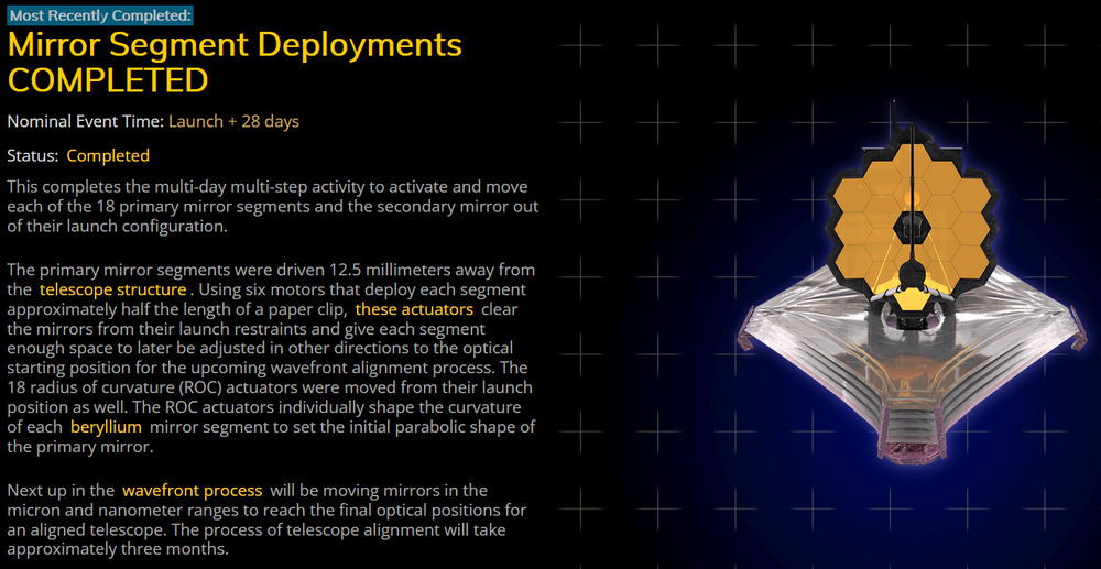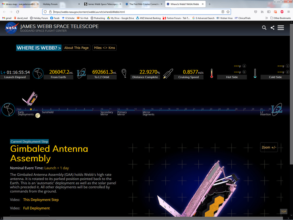 At 7:50 pm EST, Webb’s first mid-course correction burn began. It lasted 65 minutes and is now complete. This burn is one of two milestones that are time critical — the first was the solar array deployment, which happened shortly after launch. This burn adjusts Webb’s trajectory toward the second Lagrange point … we ease up to the correct velocity in three stages, being careful never to deliver too much thrust — there will be three mid-course correction maneuvers in total. After this burn, no key milestones are time critical, so the order, location, timing, and duration of deployments may change.