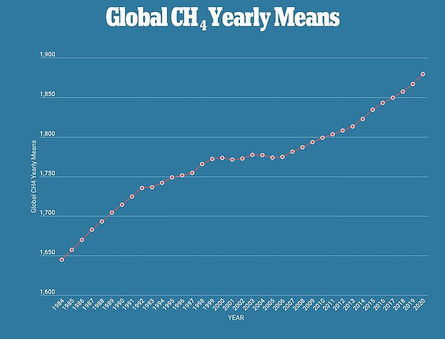 This ‘grim new milestone’ could be linked to global warming causing a rise in wetland areas, which then produce higher levels of methane, the team said.