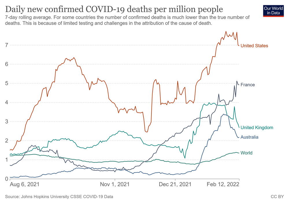 One thing I’ve noticed is that some countries seems to report low deaths each day, and retrospectively update with the full figures later. This has the effect of making it seem on a day to day basis that they aren’t incurring much trouble, and it is only when you compare month to month that you can see what the real picture is.Here is a table of the deaths per million population since the start of 2022. Australia is basically middle of the pack but is doing better than almost all developed nations.