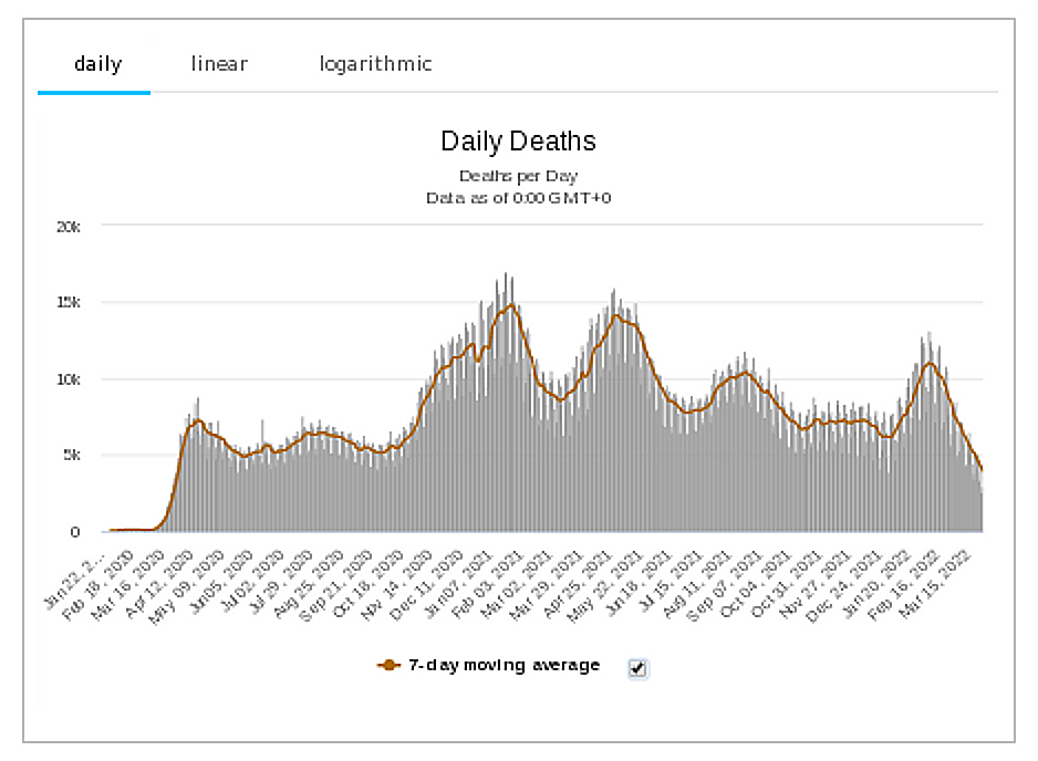 World deaths, 7 day smoothed, over the whole history, from 1 Mar 2020.