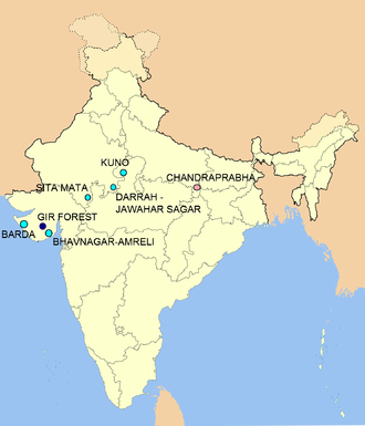 Proposed reintroduction sites in India. Pink spots indicate former populations, blue spots indicate proposed sites.