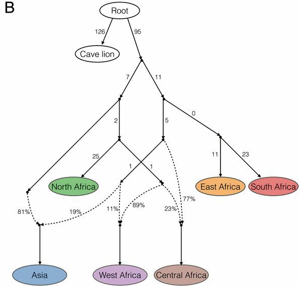 Asian lions are genetically distinct from those of east and South Africa, and seem to have descended from two waves of lions out of Africa, the first perhaps 118,0000 years ago and the second about 20,000 years ago.