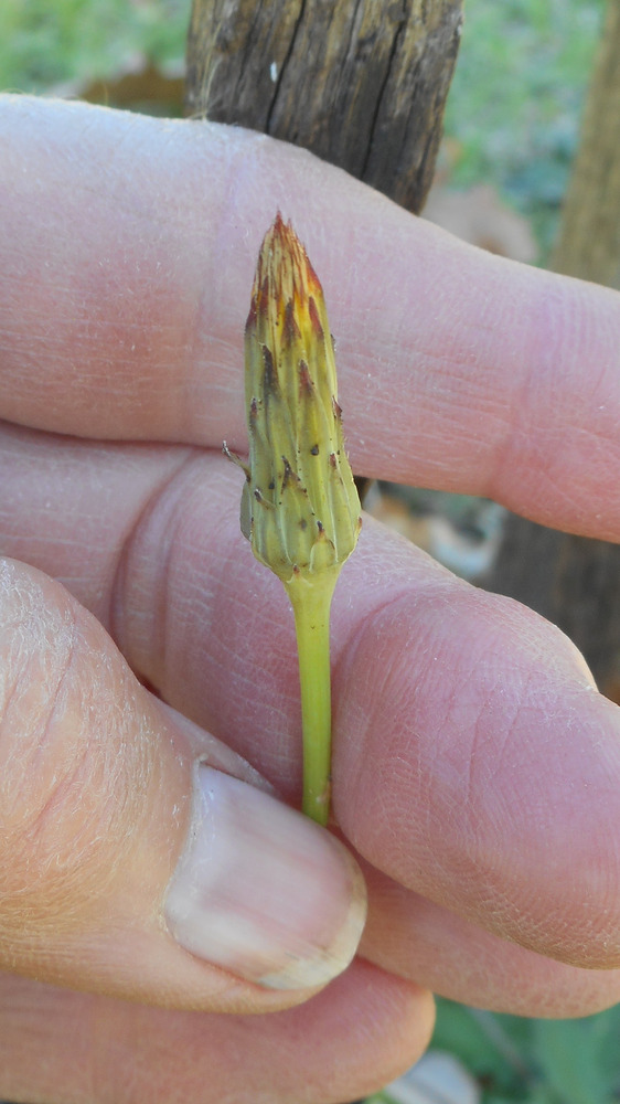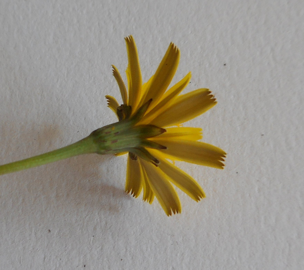OK, I’ve been out to the nature strip with my old knife and brought in two examples of yellow daisies that might be called “dandelions”. I’ll make two posts. Even though I’ve read the descriptions, I’m still not sure how to ID these. The first is a smaller one, one flower to a stem, stems not branched, stems and leaves not hairy. Some of the buds are nodding, some aren’t. There was part of a seedhead there.