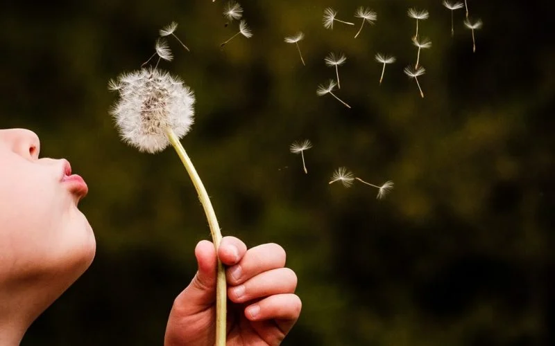 cute little girl in her Sunday dress puffing them to watch them scatter in the wind