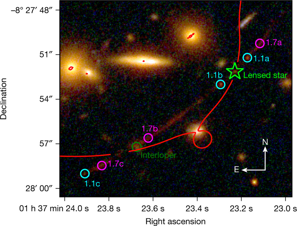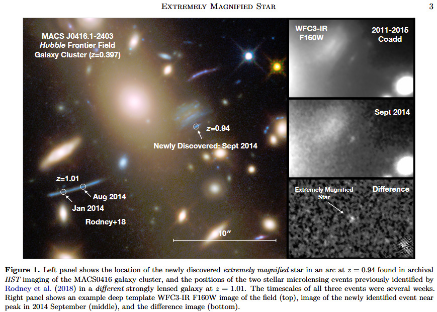 The following image is from an earlier (photographed in 2014, discovered in 2018-9 in archival search) discovery of two distant stars (the nearer dubbed “Warhol”) at redshifts of 0.94 and 1.01. The nearer of the two is a blue supergiant. The single microlensing image faded over a period of two weeks.