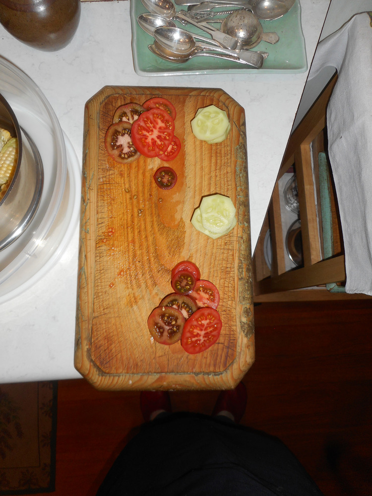 Lunch report: I’ve just etten a Red Delicious apple straight off the tree. I shall also eat some cold corned beef, some tomato (also just picked), some lettuce. Probably a pickled onion and a gherkin. And drink a big glass of cold Milo.