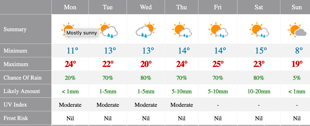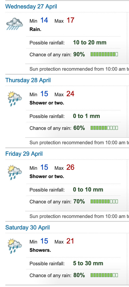 Good morning Holidayers. Presently 8 degrees and dark. Our forecast for today is for a partly cloudy 20 degrees. I’ll have to continue watering the veggies in the evenings. The 5 day forecast has a couple of “rain” mentions, but under 50% of under 0.5mm. Waiting on that Autumn break here. The farmers like that to be around St Patrick’s Day. It’s running a bit late.