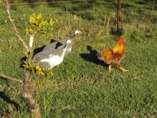 Guenia fowl and there blue partridge rooster for a mate, get along well he thinks he’s one of them.