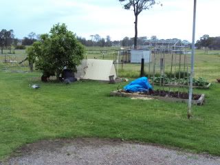 Photo of all 3 Garden beds near car ramps and Paddock gates, Main chook pens in background. All gardens have something growing in/on them (these 3 and 2 others)