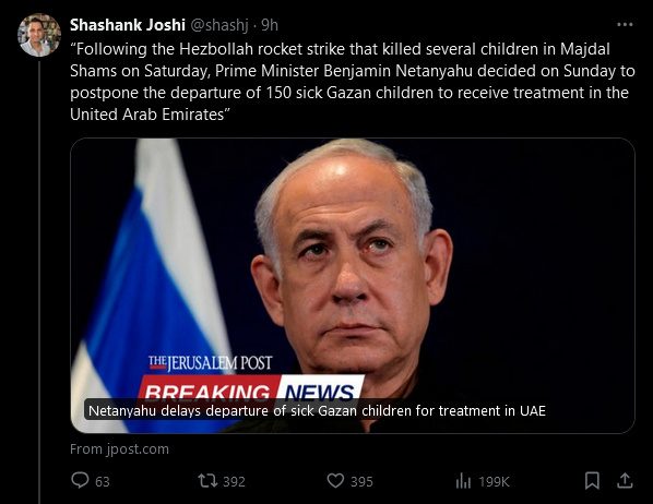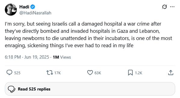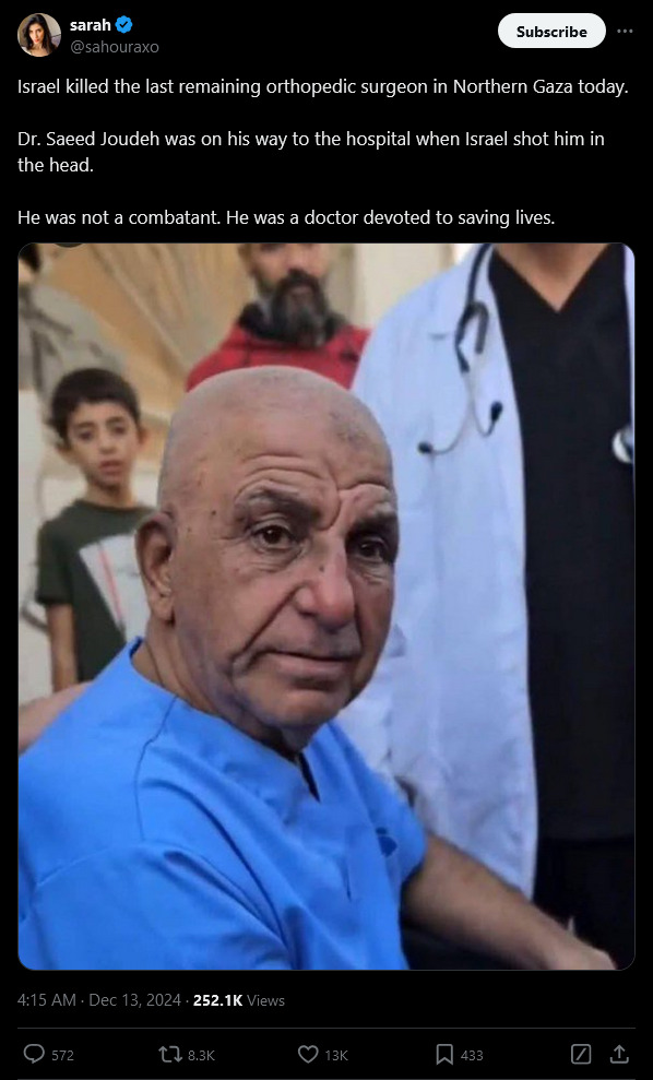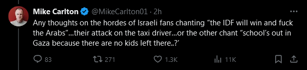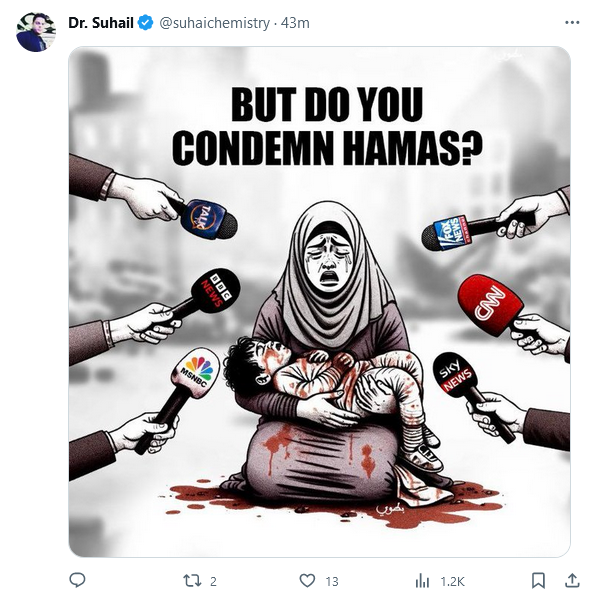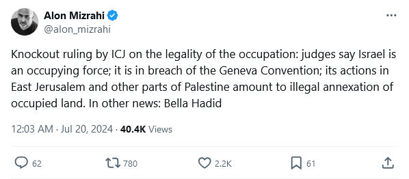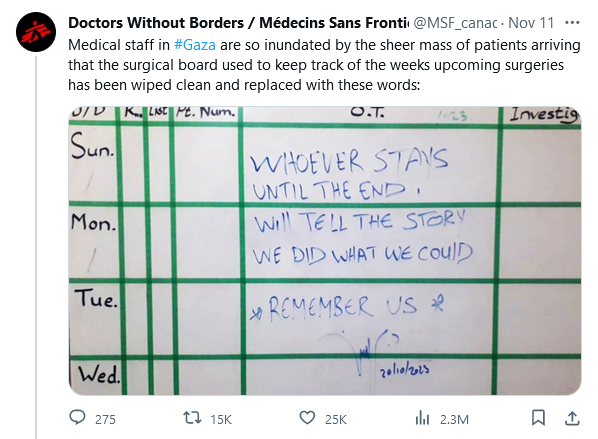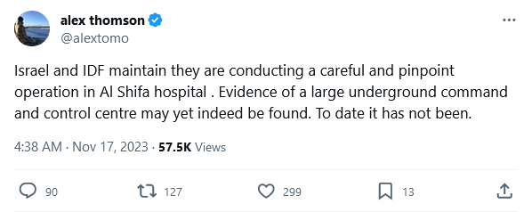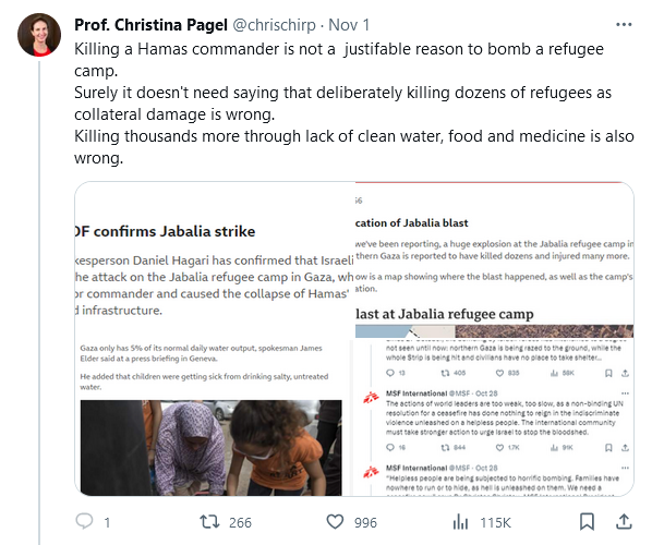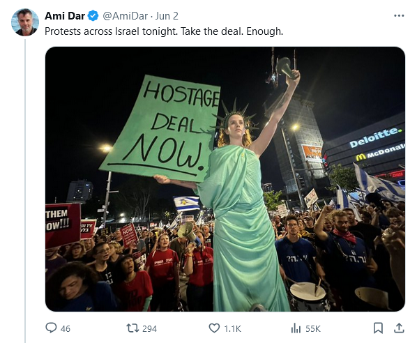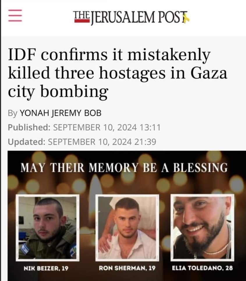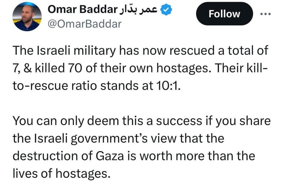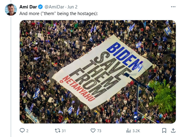 I appreciate the juxtaposition you’re making there but one distinction is that the Israeli hostages held by Hamas are indisputably civilians while those Gazans in Israeli jails are probably held captive under the laws of war. That is not to say there are not hundreds of thousands of Gazans who wish their deceased relatives were lucky enough to be languishing in Israeli captivity.