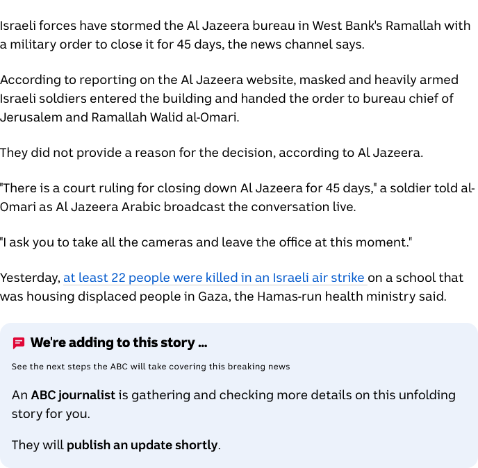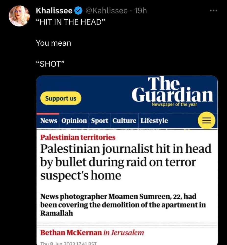 Amateur videos as well as witness accounts have shown no evidence of militants in the vicinity and the area appeared to be quiet for several minutes before she was shot. Ms Abu Akleh was wearing a helmet and vest marked “press” at the time.