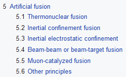 Let’s see. The four main ones are: H-bomb, Tokomak, Z-pinch and Laser-induced.