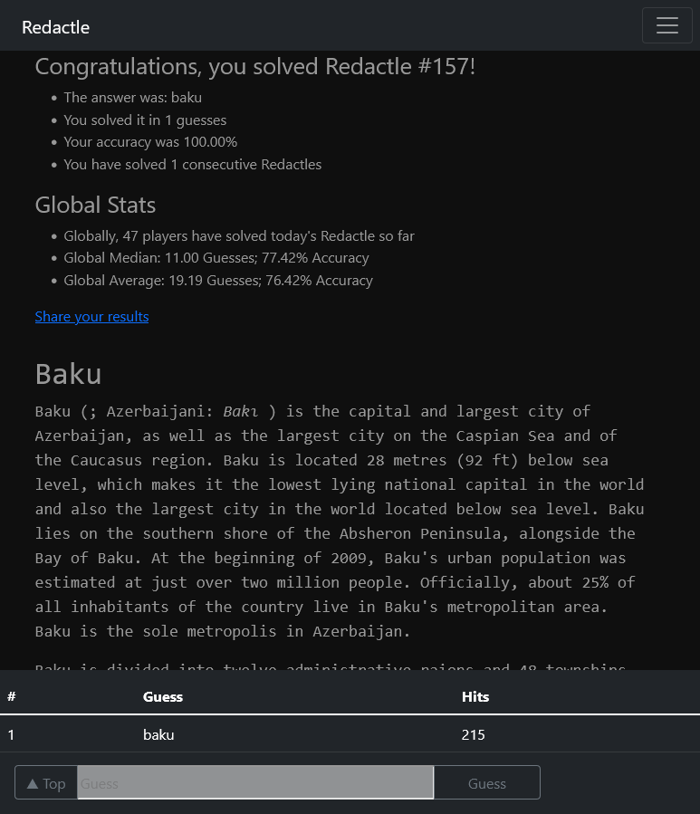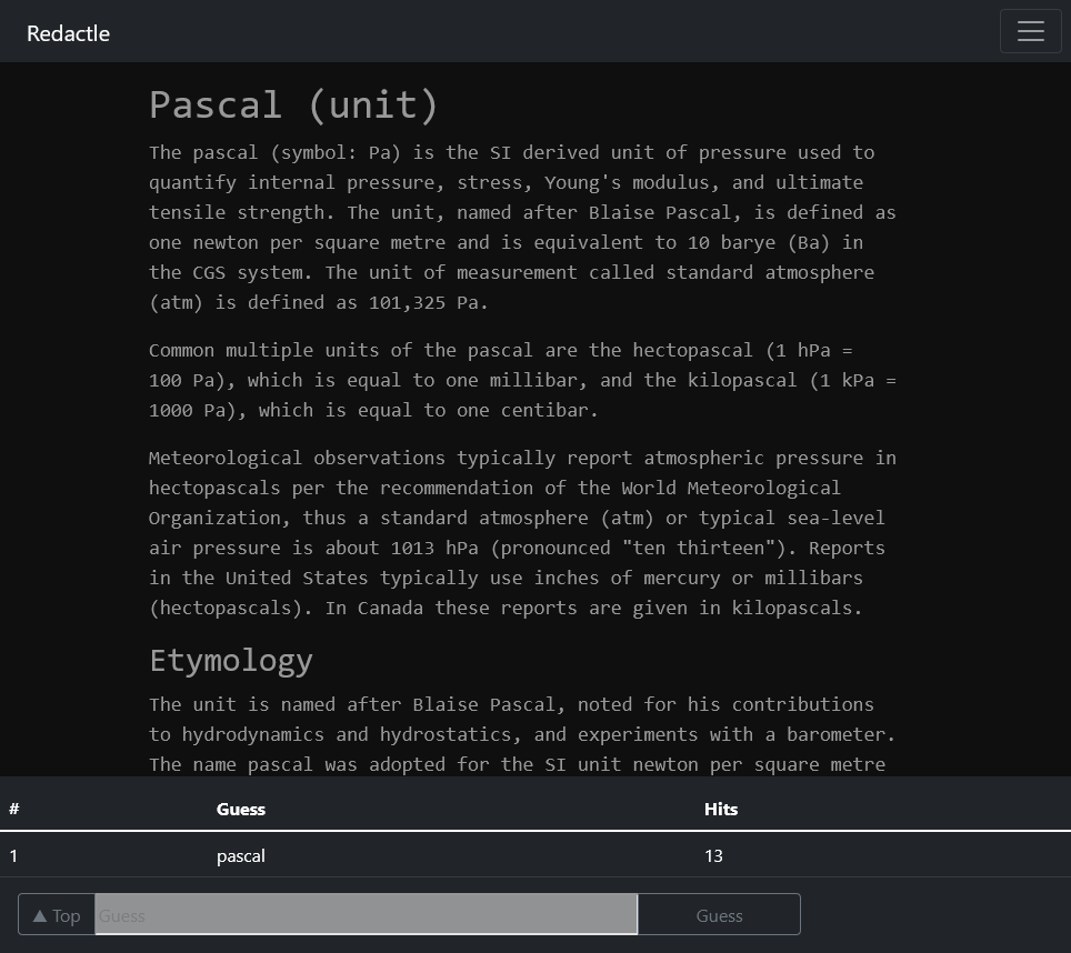 Redactle is a daily browser game where the user tries to determine the subject of a random obfuscated Wikipedia article, chosen from Wikipedia’s 10,000 Vital Articles (Level 4).