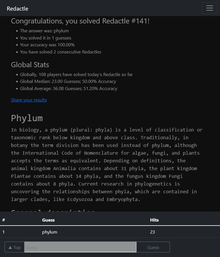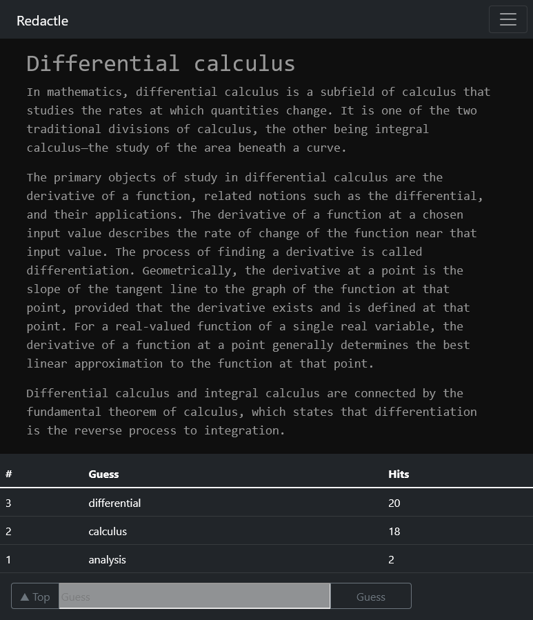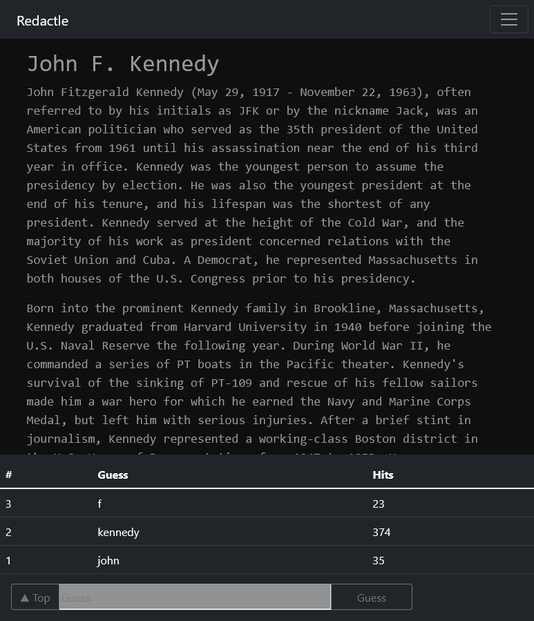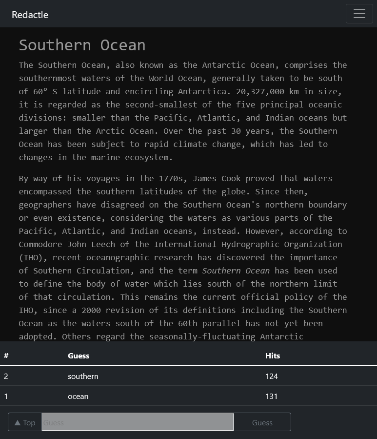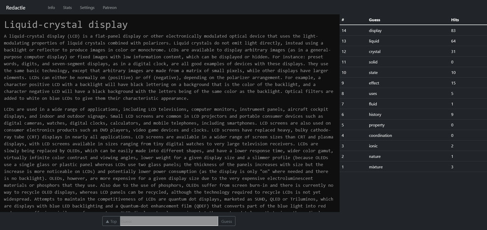 Redactle is a daily browser game where the user tries to determine the subject of a random obfuscated Wikipedia article, chosen from Wikipedia’s 10,000 Vital Articles (Level 4).