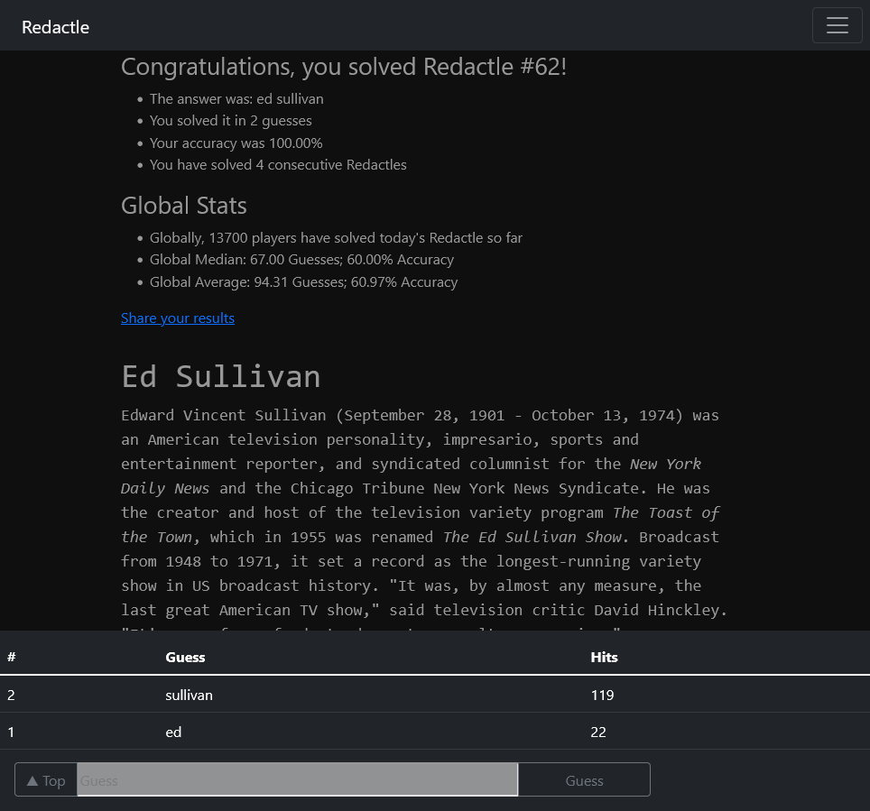 (Post in the Goodnight thread. Oh yeah. One more quick look at Redactle before shutting down for the night.