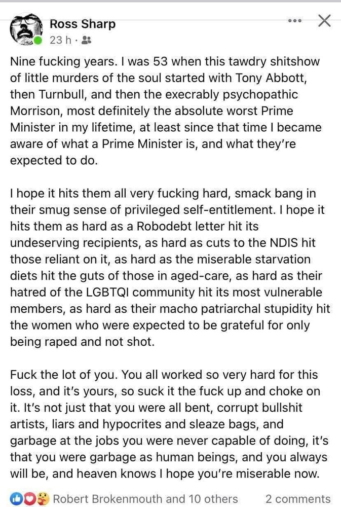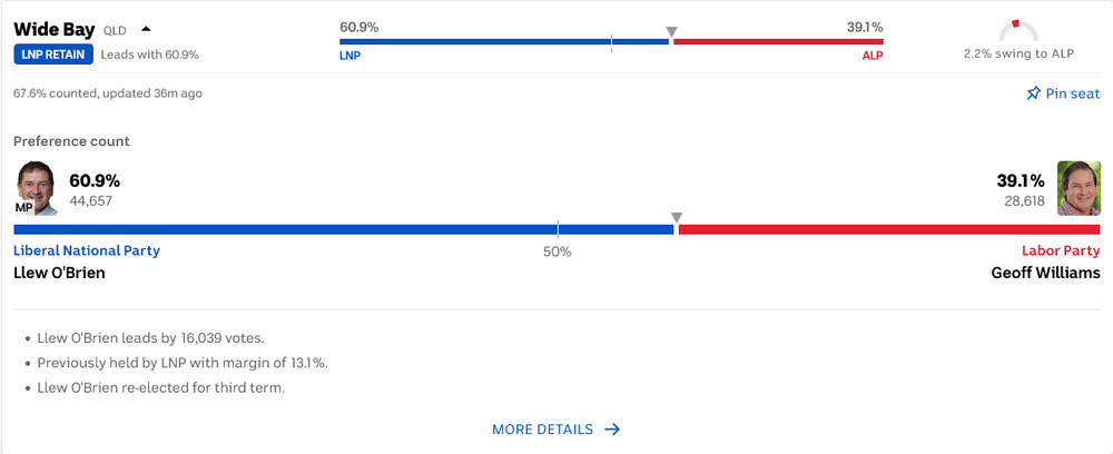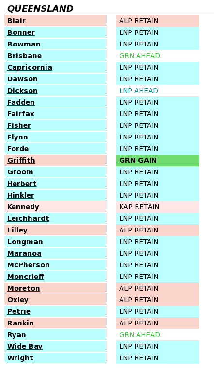 On a state by state basis the results were also pretty much as polled except for Qld , with most pollsters saying it would be 51-49 for ALP, but it went 54-46 for the Coalition, a big miss. In fair ess the “undecided” stayed pretty fat in Qld even in the final weeks so I guess a lot of them finally decided to go with the Coalition.