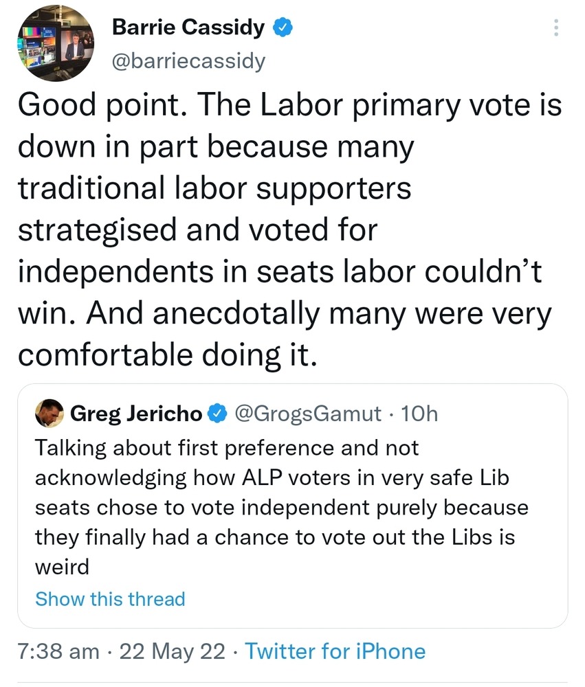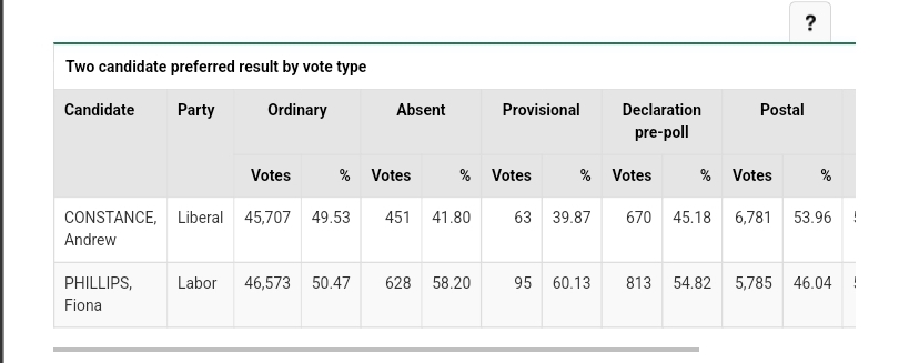 I suppose it is a good thing that more voters on the conservative side preferred Labor over One Nation, I’ll give them a respectful nod for that, but it is also noteworthy that 40% of them did not include either of those parties in their preference list.