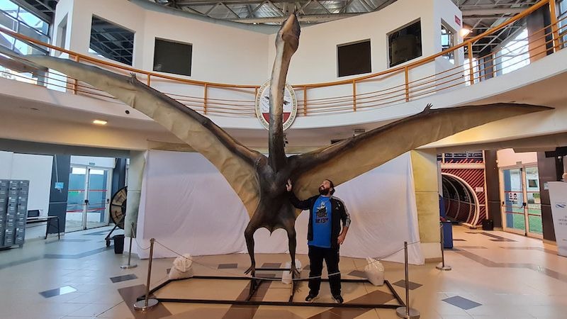 Paleontologist Leonardo D. Ortiz David stands next to a life-size reconstruction of Thanatosdrakon at the Laboratory and Museum of Dinosaurs at the National University of Cuyo in Mendoza, Argentina.