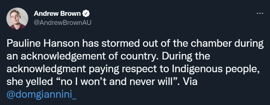 “Pauline Hanson disrespectfully stormed out of the acknowledgement of country in the Senate, refusing to acknowledge ‘those people’. You want to make parliament safe? Get rid of racism.”