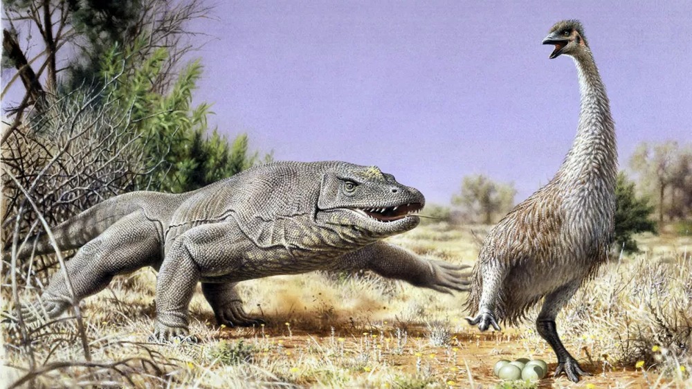 Even demon ducks had predators. Here, the giant “demon duck of doom” (Genyornis newtoni) flees its nest, pursued by the extinct lizard Megalania (Varanus priscus). Both species lived in Australia about 50,000 years ago.