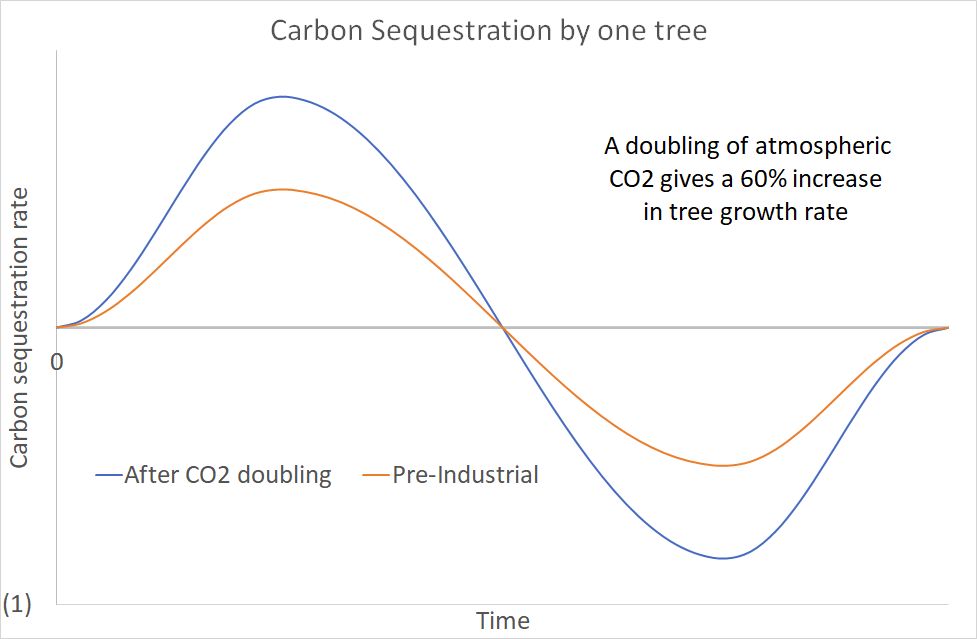 Higher co2 levels will increase the growth rate of SOME trees, but these are the faster growing broadleaf species that will progressively reduce the light able to reach slower growing species along with lower story ones too. This will eventually result in large forest areas being dominated by just a few species to the detriment of biodiversity.