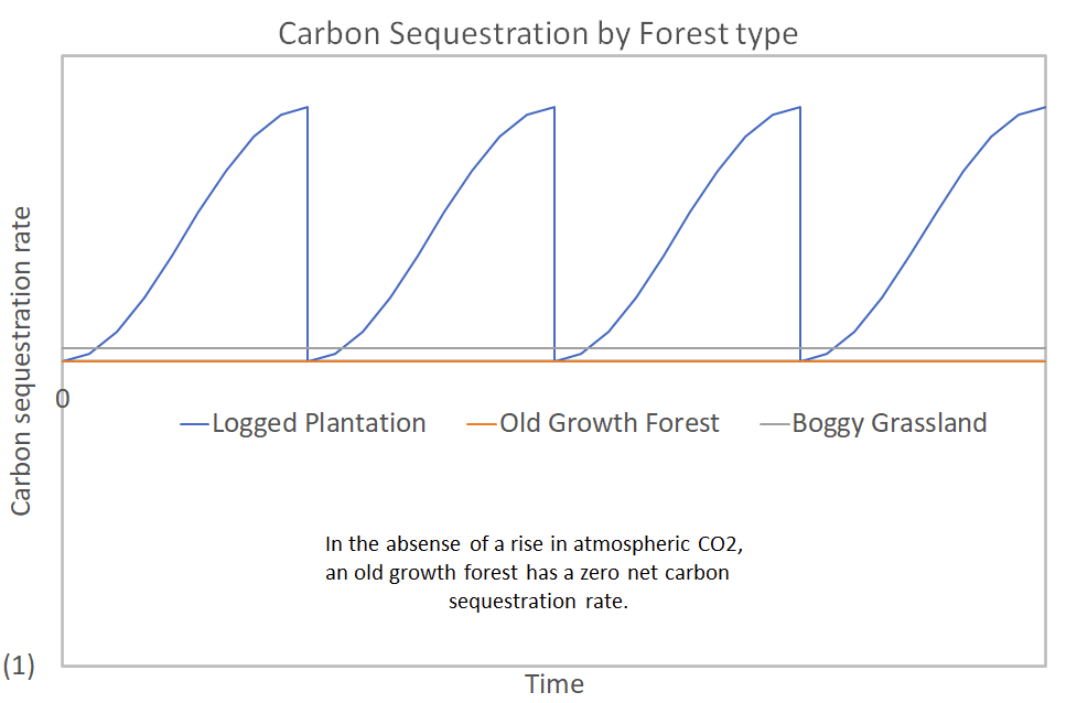 Without logging, and in the absence of a rise in atmospheric CO2, an old growth forest has a zero carbon sequestration rate.