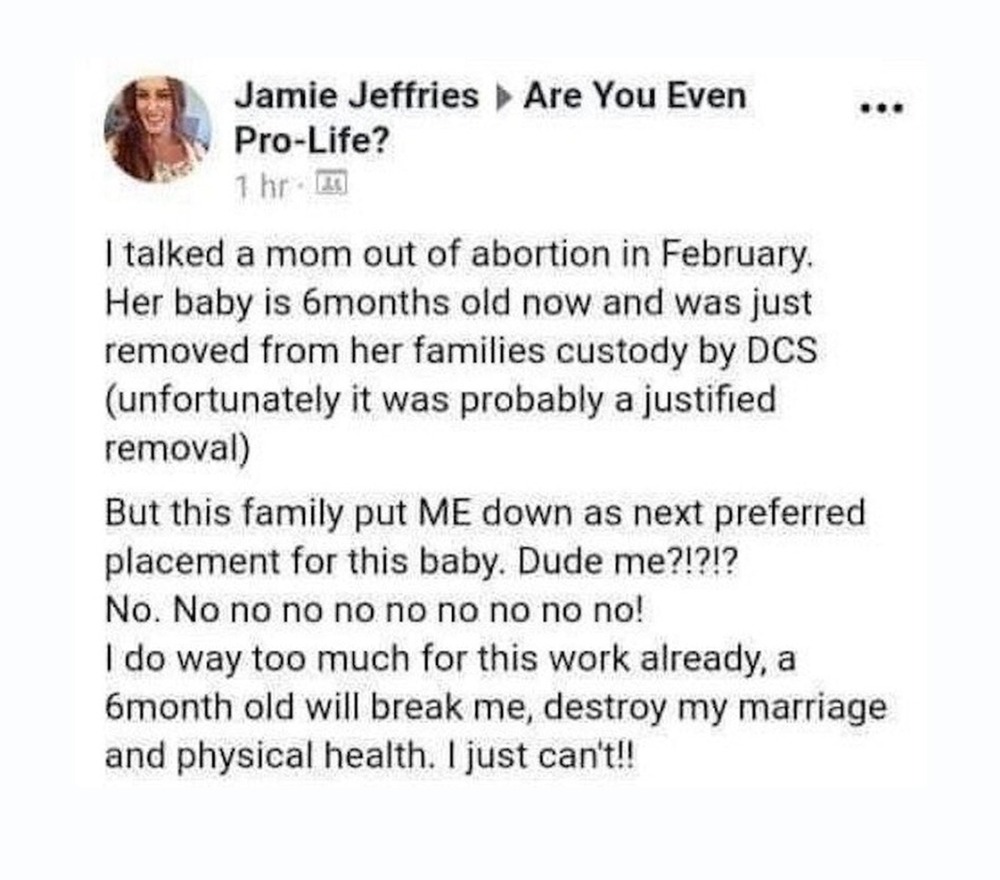 Equal stabilization obligations. Women have to risk death because the fetus — the fetus they want to become their child — has some imagined equal status under the law to a living, grieving human being.