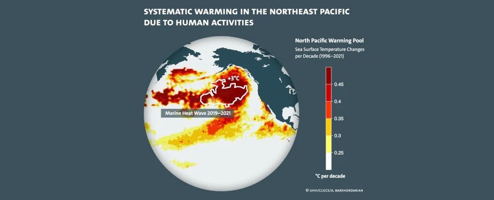 Barkhordarian and colleagues detected a persistent pool of warmed water in the Northeast Pacific with increased annual mean temperatures of around 0.4 °C per decade. Summer water temperatures now linger for 37 days longer than 20 years ago.