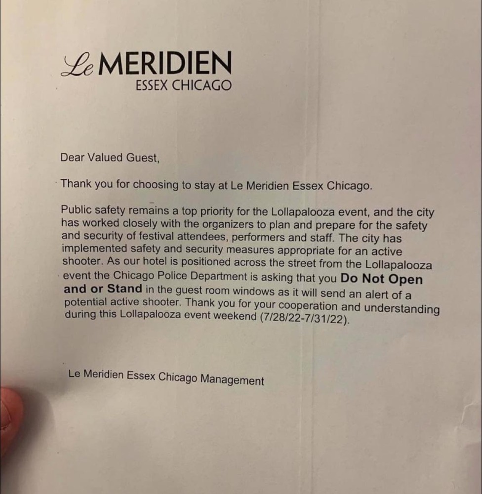 I think it means that if someone is taking potshots at the Lollapalooza crowd, you may not wish to be seen in a window of a nearby building lest you be suspected and invite counter-fire from panicky cops.