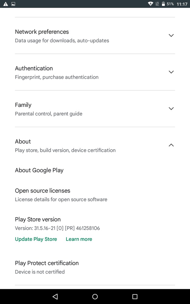 It tells me that it is not āplay protect certifiedā (got to Playstore, menu>settings>about) at the bottom. see below.