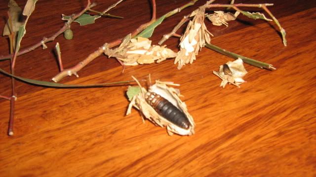 apparently the caterpillar lives in the case. it comes out the top to feed and has a toilet hole in the bottom. it takes several years to pupate.