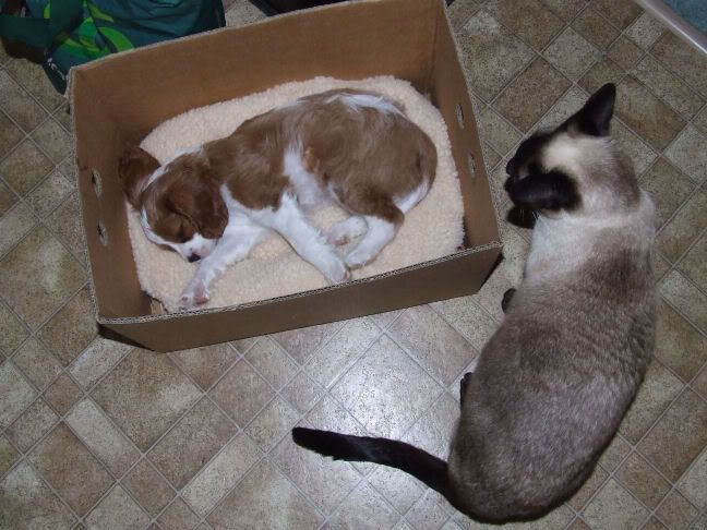 Harley wanted the box and wasn’t impressed when he saw Bobby having a sleep. Kids went out and bought the little wollen poffy thingo yesterday for Bobby. Elf found a box for Bobby to sleep in.