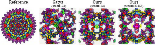 What seems to break the algorithm here is that the pattern is too big to handle. The software isn’t designed to handle coherence over such large distances, as with Leonardo Dicaprio’s face. And it shouldn’t be designed for such large distances, because then it is no longer a “texture” but instead a “pattern”.