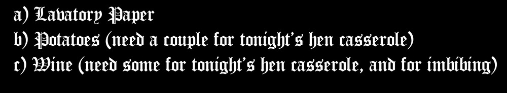 I also must venture shopwards to lay in comestibles. A nuisance, but needs must.
