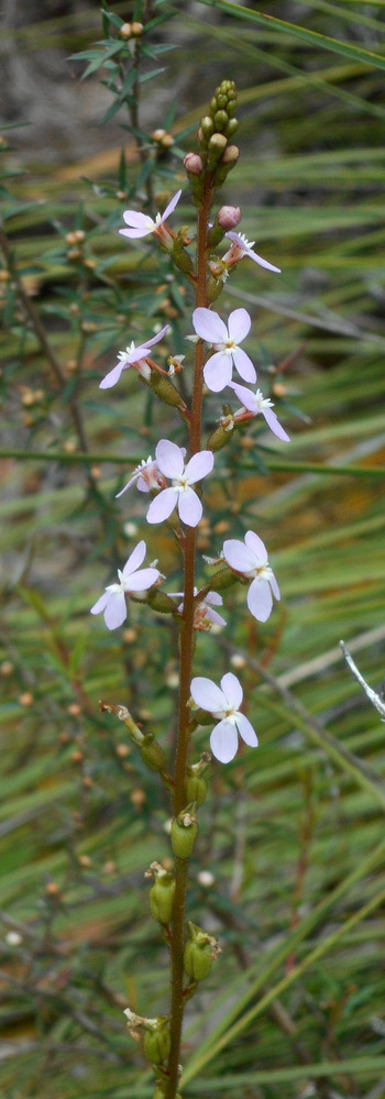 Baeckea virgata – Weeping twiggy myrtle. Native shrub with weeping habit, bearing masses of small white flowers along the branches in Spring and Summer. Foliage is deep green and very slender.