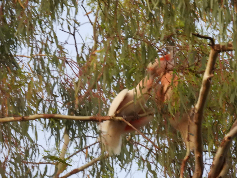 It was as the sun was disappearing. The light was gone and I tried to photograph the young pink cockatoo being fed. Sadly they were 25m up the yellow box in very low light. It is wjat