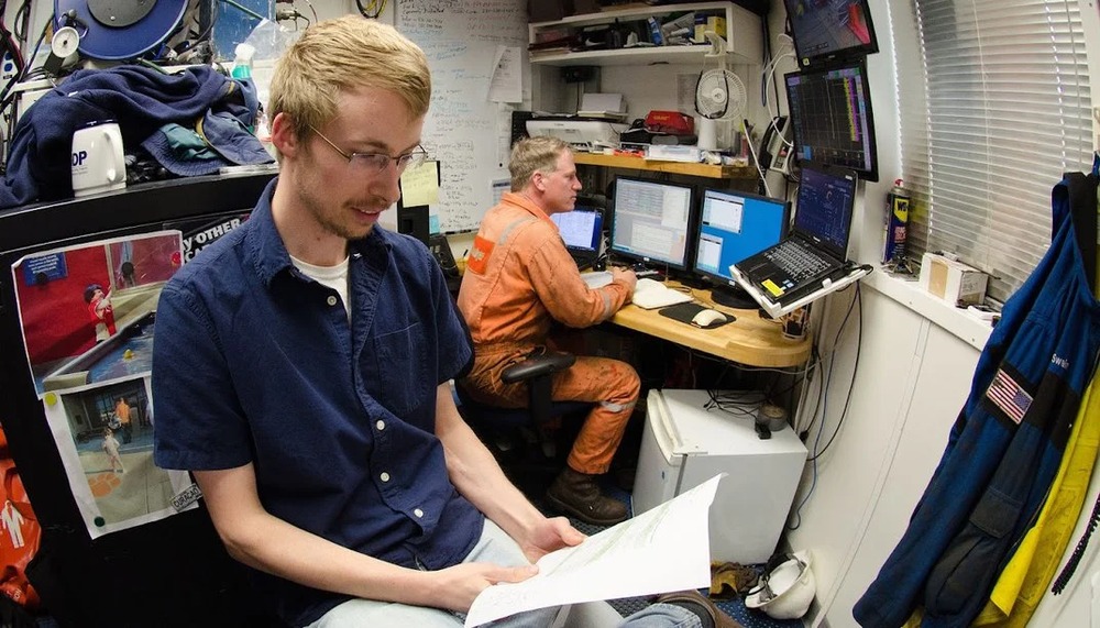 Matt Jones, a former Smithsonian research fellow, examines data aboard the JOIDES Resolution research vessel alongside his colleague, Kerry Swain