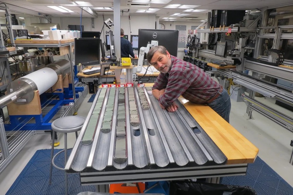 Research geologist Brian Huber with core samples collected from the seafloor off the coast of Western Australia.